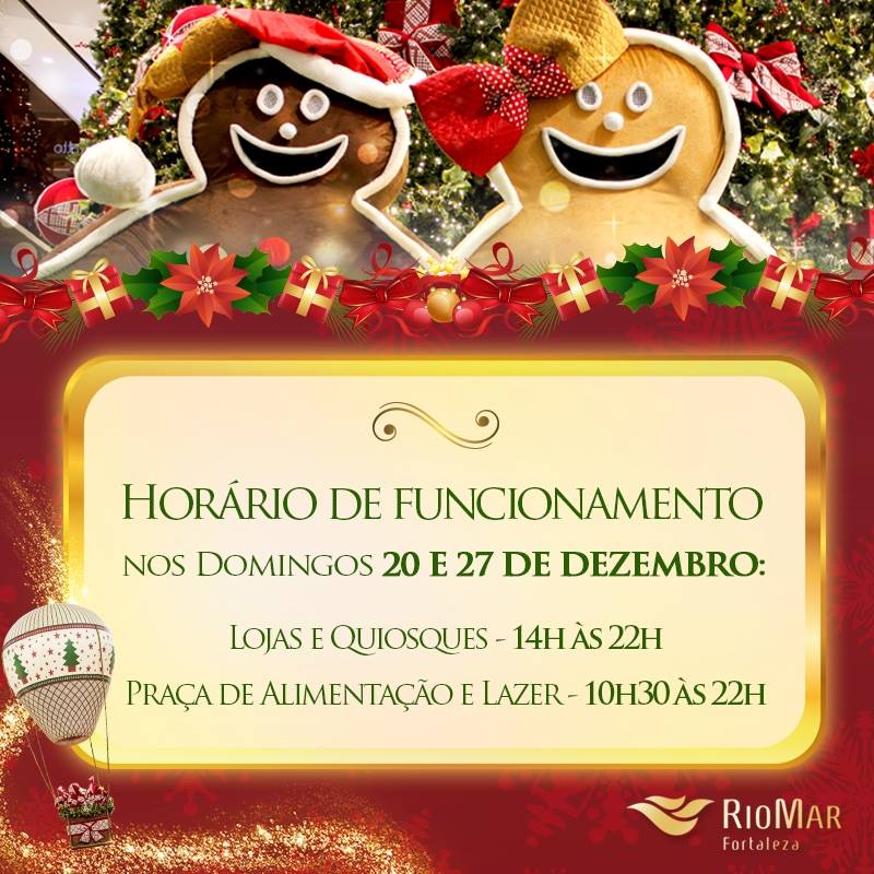 No domingo, dia 27 de dezembro, o horário de funcionamento do shopping será estendido por conta das compras do final de ano. Lojas, quiosques e posto de troca da Promoção de Natal abrirão das 14 às 22 horas. As demais operações, como lazer e entretenimento, além da Pracinha RioMar, ocorrerão normalmente nos seguintes horários: